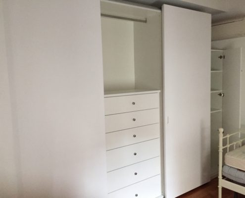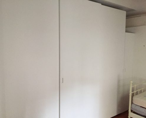 Le ante con la maniglia incassata sono in tamburato, laccate bianco, per essere ultra leggere.