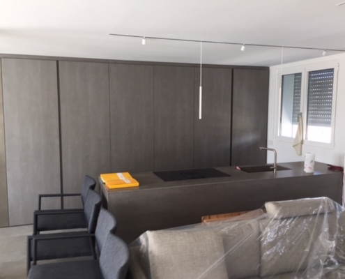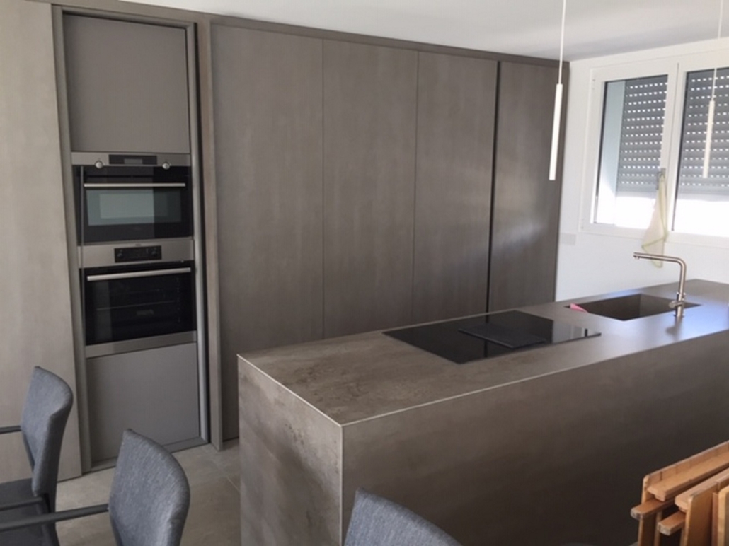 Cucina su misura in laminato Fenix. Cucina su misura con colonne che coprono tutta la parete dove abbiamo integrato gli elettrodomestici. La penisola con il piano in Dekton con lavello e piano cottura integrato.