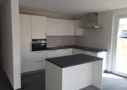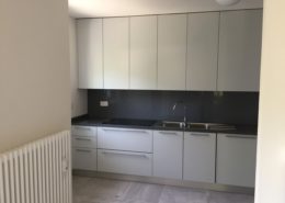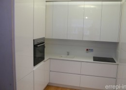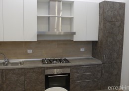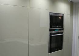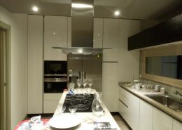 Cucina su misura laccata bicolore con maniglia incassata nera.