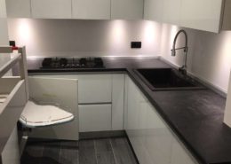 Piano di lavoro e fianchi laterali sono costruiti in Dekton di spessore 2 cm.