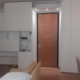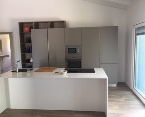 Cucina su misura con ante e fianchi a vista laccati opachi a campione. Le colonne oltre agli elettrodomestici sono attrezzate con cestelloni estrabili ammortizzati. L’isola ha il piano in quarzo, il  lavello e piano cottura sono  filo tops con cappa integrata nel piano cottura ad induzione. Si comprende che la cucina sia su misura anche dalla profondità dell’isola.