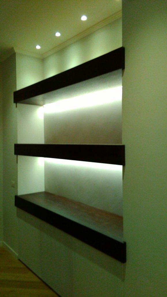 Le mensole corrono da muro a muro e sono realizzate in listellare rovere tinta Wengé.