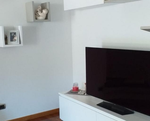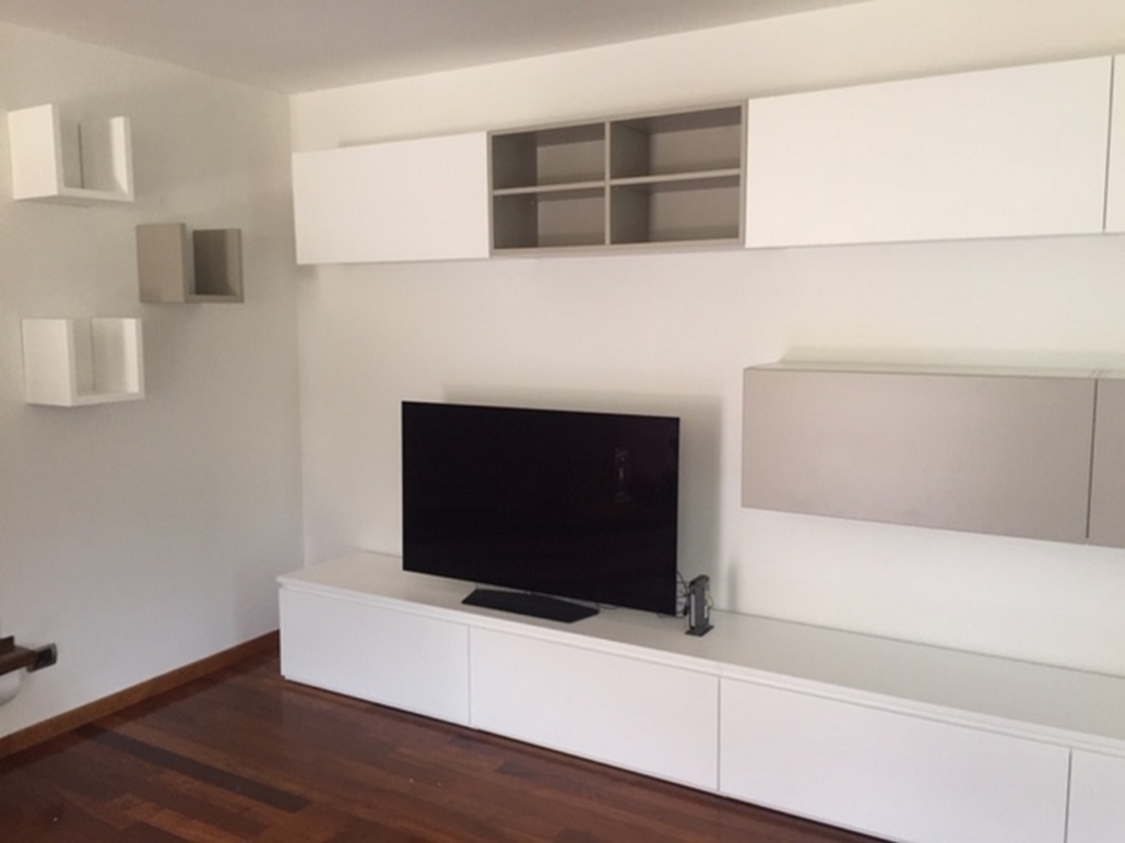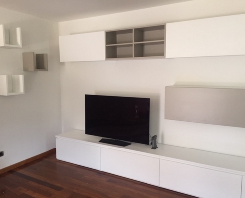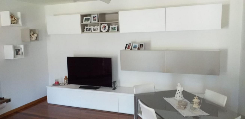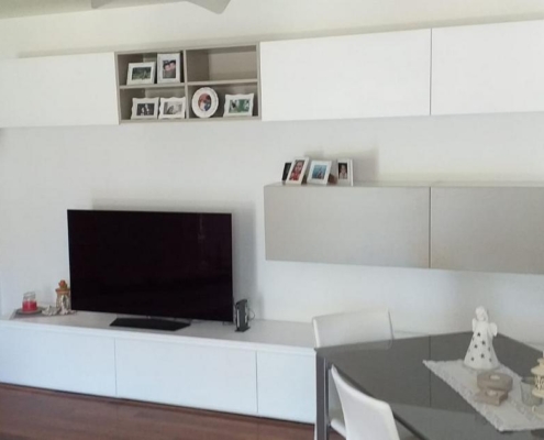 Soggiorno su misura completamente laccato opaco bicolore. Cassettoni e pensili i con ferramenta blum con frizione. Tavolo con piano superiore in vetro verniciato come il mobile.
